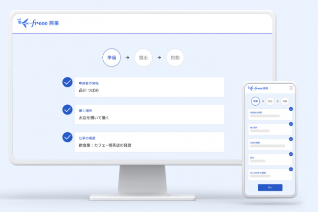 開業freee(フリー)は画面に表示された質問に対して、適切な入力や選択を進めていくだけで、開業届や青色申告承認申請書などの作成が完了します。